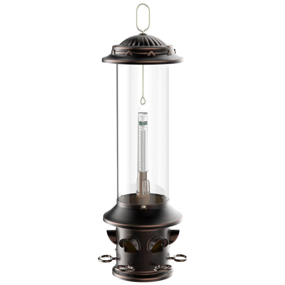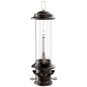 Feed birds (not squirrels!) and discourage bully birds with the revolutionary Squirrel-X5 Squirrel-Proof Bird Feeder! If a squirrel tries to feed on any of the 6 spring-loaded perches, the X5’s integrated design shuts every port simultaneously, stopping racketeering rodents right in their tracks. 6 adjustable comfort perches provide bird selectivity, and their durable, round design attract a wide variety bird species. Adjustable weight springs are easily accessible on the base to change weights of closure mechanism to keep out larger “bully” birds like grackles, doves and blackbirds - simply adjust the central tension spring post to feed the birds of your choice! The X5 disassembles into 3 simple sections for thorough cleaning. The extra tall tube design hinders squirrels from reaching the seed ports from the roof, while its generous 3.7 lbs. seed capacity lasts longer between fillings. The wide opening, push-and-twist metal locking lid quickly removes for effortless refilling, while the metal port hoods and built-in baffle keep moisture out. With a rugged metal die-cast frame, elegant dome design and oil-rubbed bronze finish, the Squirrel-X5 combines strength & style to bring you the ultimate in squirrel-resistant bird feeding and your best defense against squirrels!